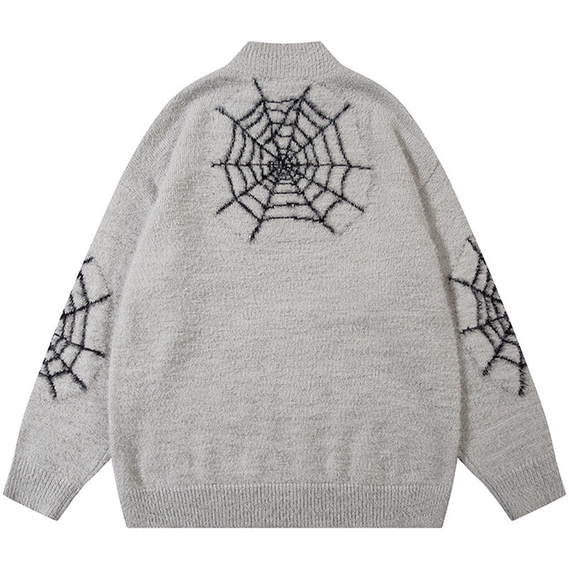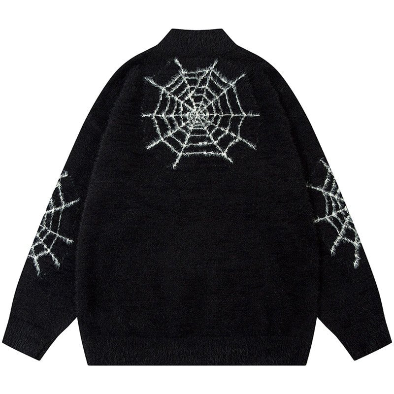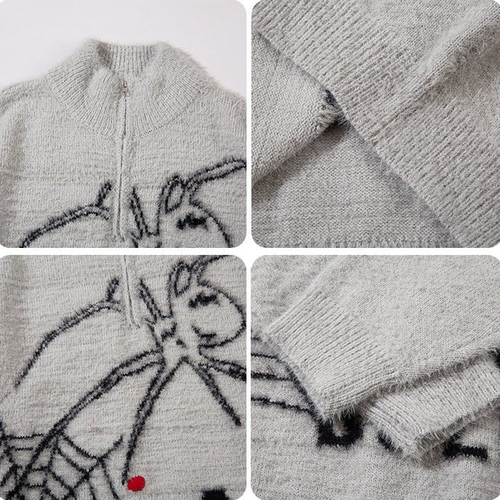 - Design: Behold the captivating spiderweb pattern that weaves its magic across this unique sweater. The half-zip design introduces a touch of versatility, while ribbed cuffs and collar snugly cocoon you in warmth. The trendsetting spider motif adds an edgy yet elegant touch, ensuring you stand out effortlessly.