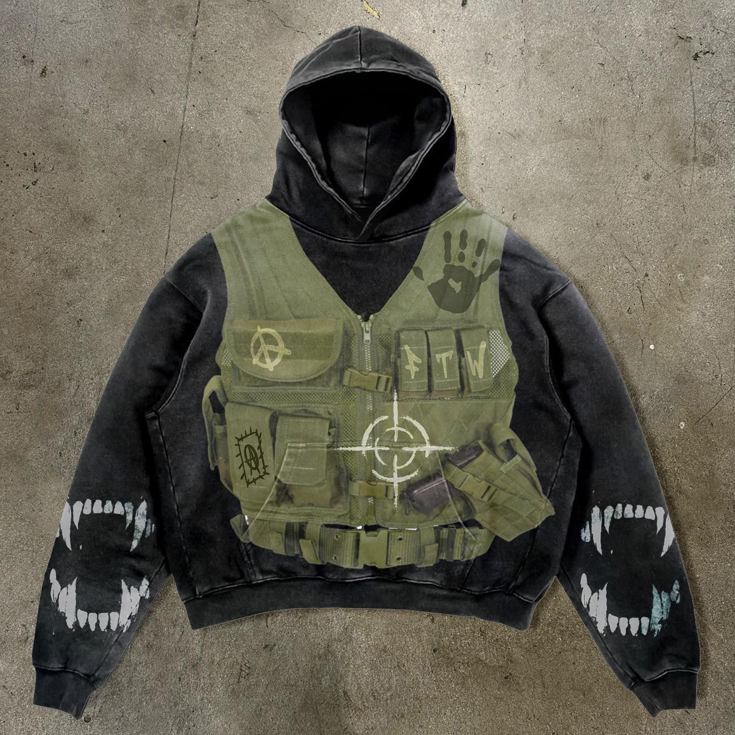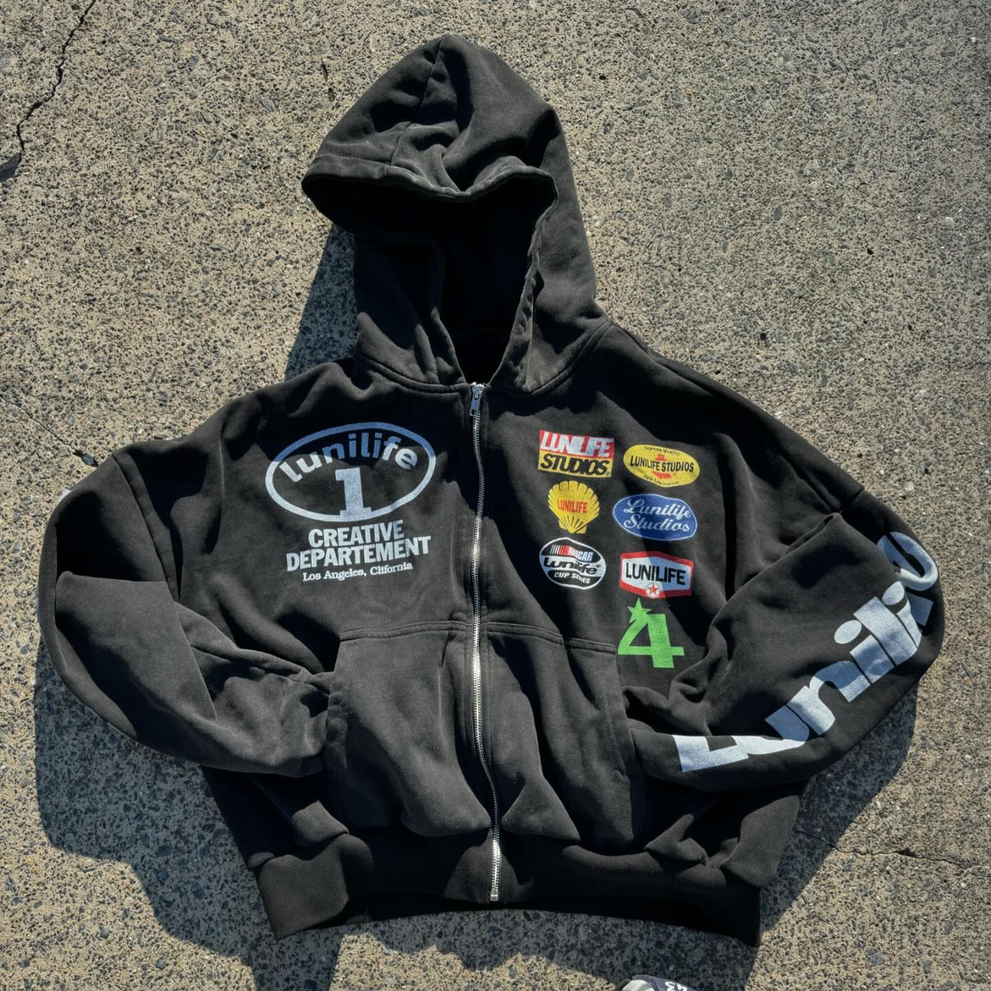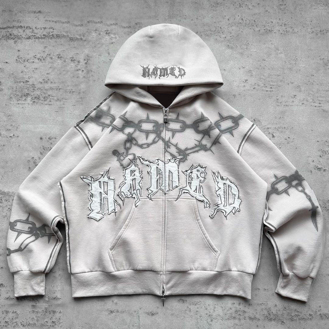 High Street Letter Patch Print Zipper Mask Hood Hoodie